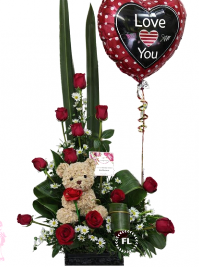 Tradicional arreglo de 12 Rosas rojas en base de cerámica con osito de peluche y globo de 18" con helio.