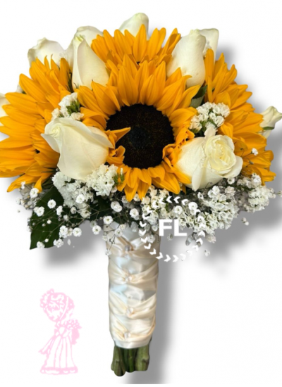 Hermoso ramo de mano compuesto por 5 girasoles y 12 rosas