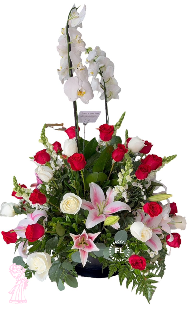 NOTA: El tono de flores, follajes o base pudiesen variar según existencias, en el caso de no contar con algún de ellos será sustituido por similares del mismo valor o superior.