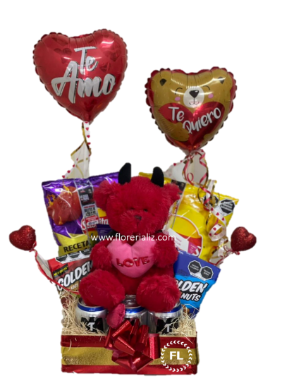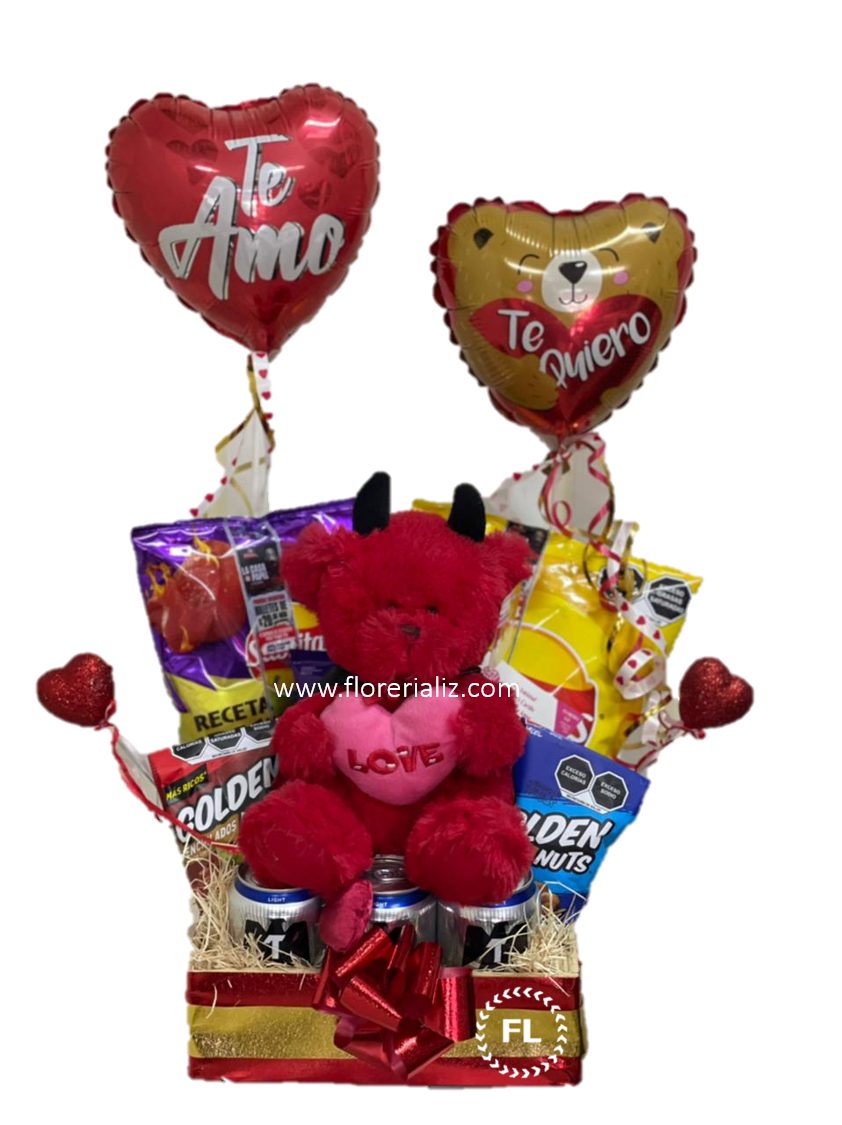 Original detalle compuesto por 6 cervezas de lata, botana surtida, 2 globos de corazón con popote, osito de peluche