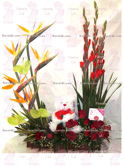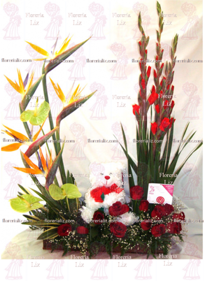NOTA: El tono de las flores, base, peluche y follajes pudieran variar según existencias, en caso de no tener algún follaje, base, tipo o tono de flor será sustituido por flores similares del mismo valor o superior.