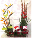 Diseño exótico compuesto con aves del paraíso, anturios, puntas de gladiolas y rosas rojas