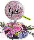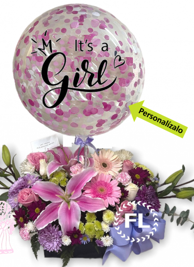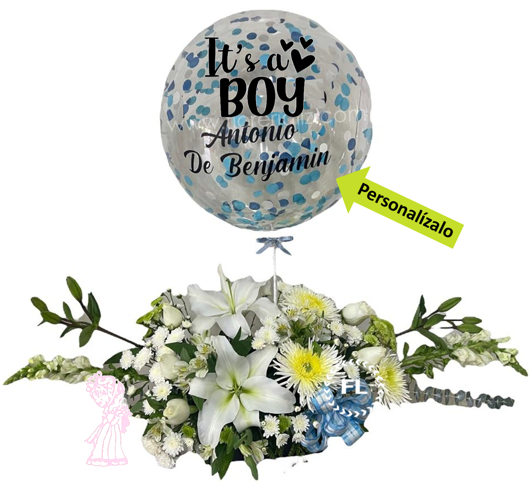 Jardinera de flores surtidas, incluye globo burbuja personalizado, tu eliges la frase, se realiza para niño y niña cambiando los tonos