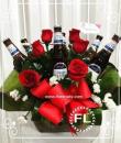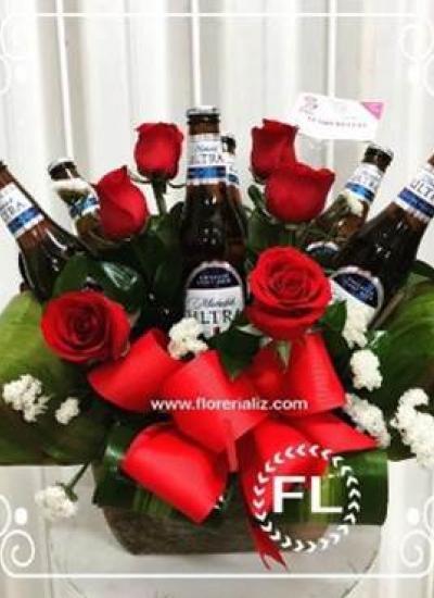 Excelente detalle para Él, arreglo de rosas con cervezas y moño de tela