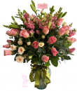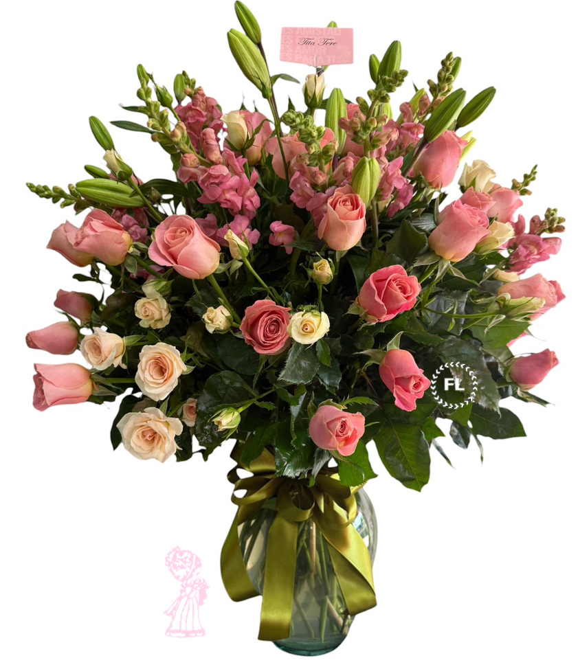 Jarrón compuesto por 30 rosas, 10 tallos de mini rosas, 4 varas de lirios, 10 varas de perritos