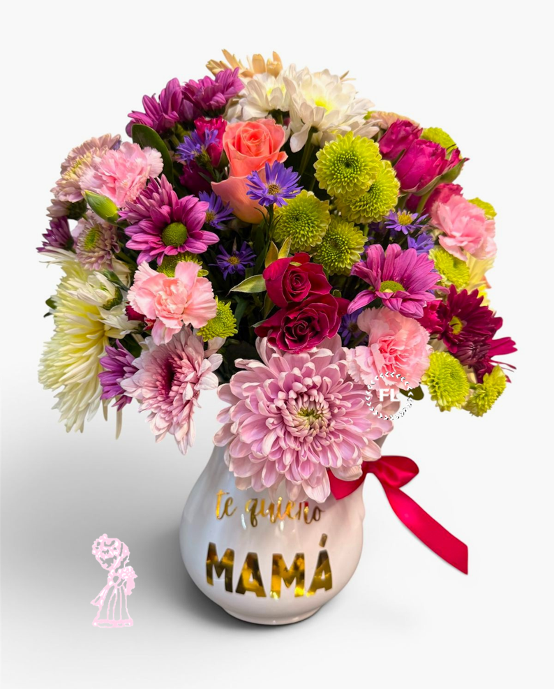 Hermosa jarra de cerámica compuesta por flores surtidas, incluye una frase