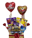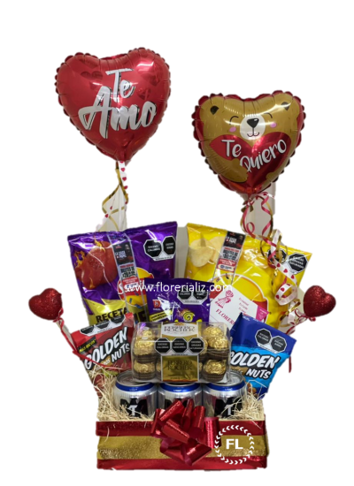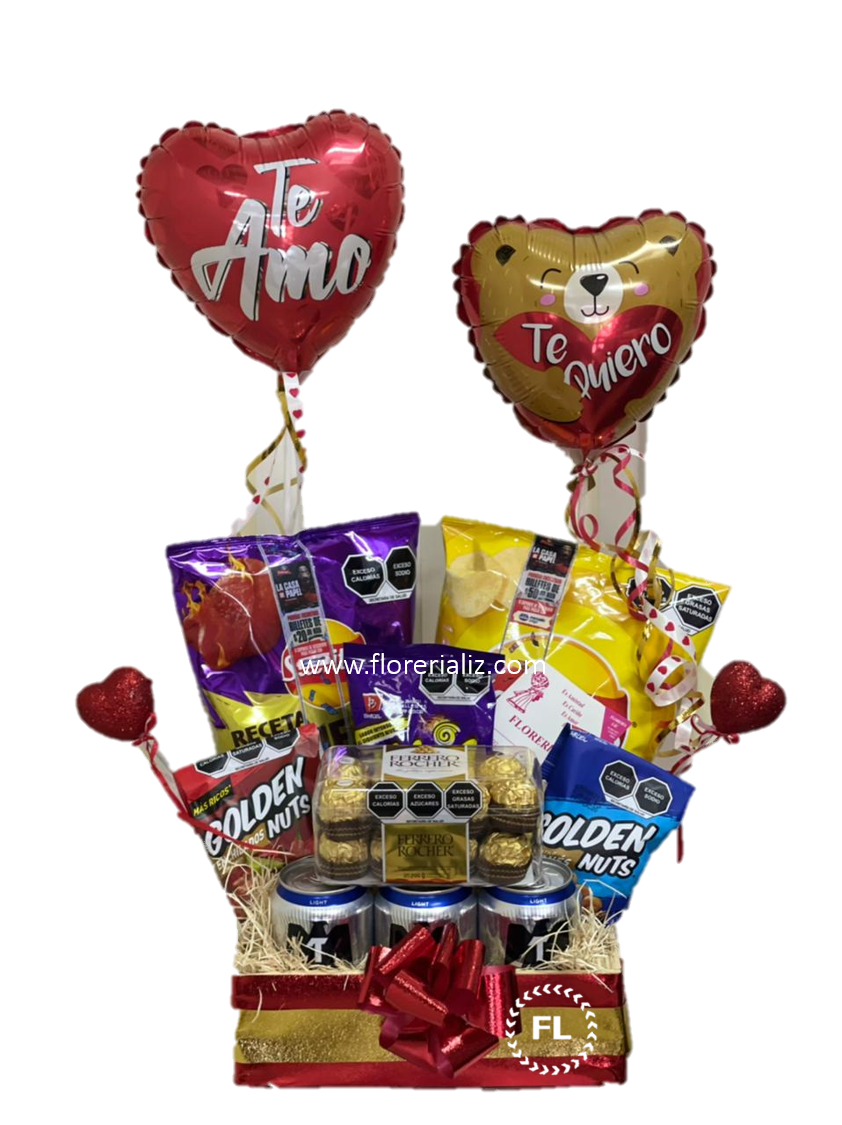 Arreglo de globos para caballero compuesto por botanas, cervezas (6 tecates pueden ser rojas o light a elección del cliente) y caja de chocolates ferrero, el diseño de los globos y marcas de los productos pueden variar según existencias y ocasión.