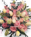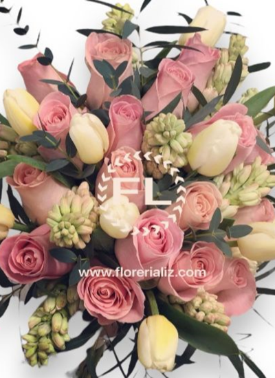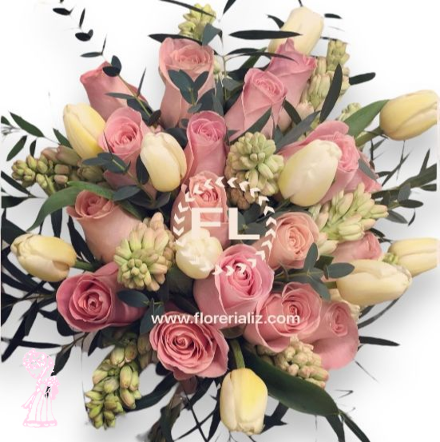 Bellísimo ramo natural , con 10 tulipanes, 12 rosas, nardos y finos follajes .
