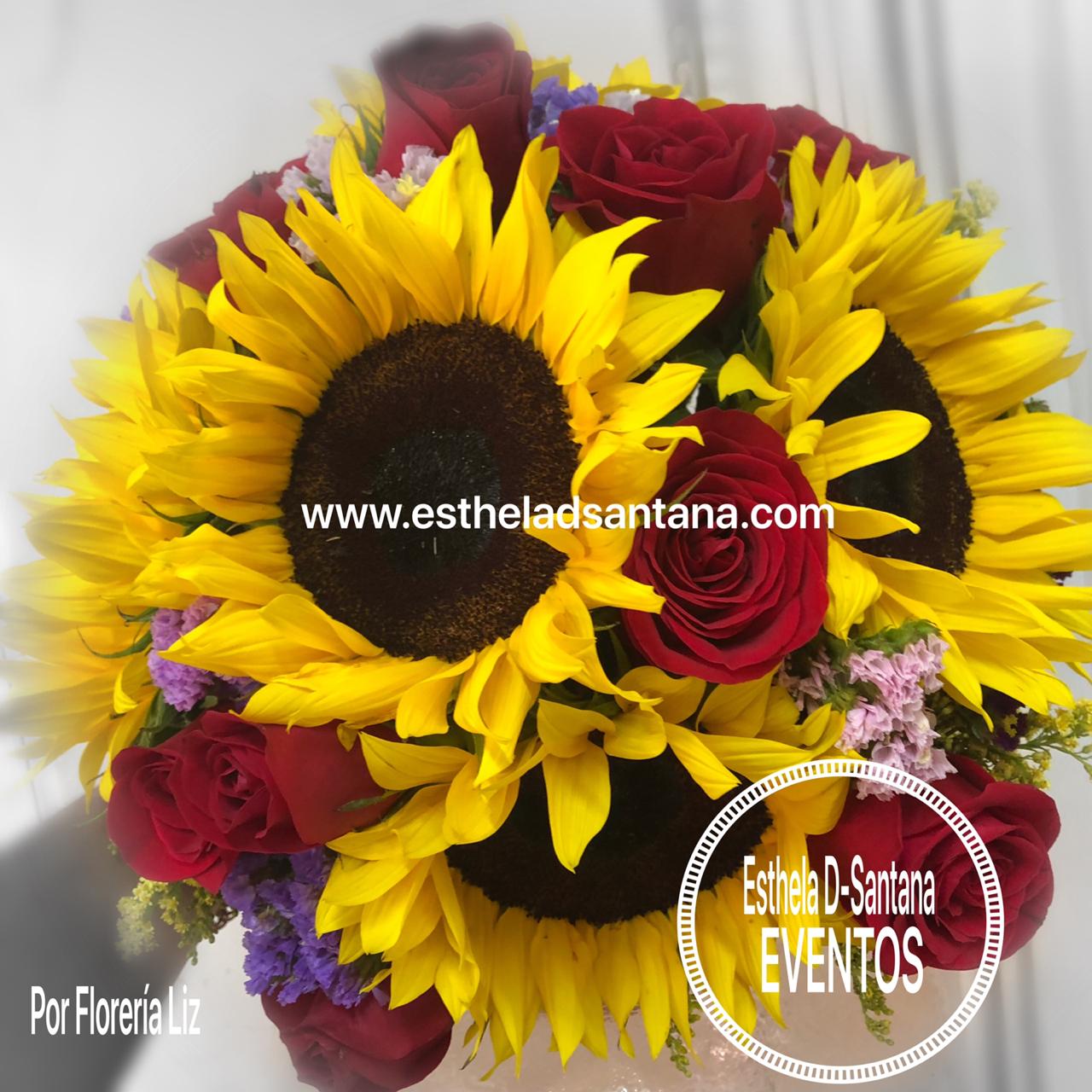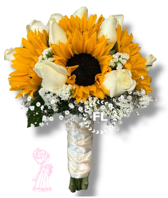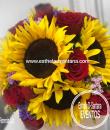 Hermoso ramo de mano compuesto por 5 girasoles y 12 rosas